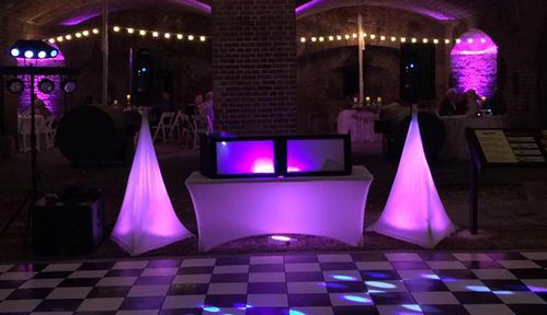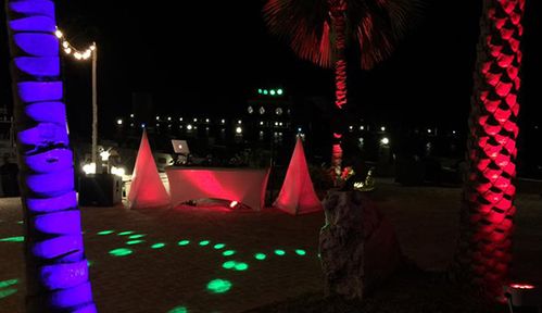 We use only the best in dance floor lighting from LED movers to color changing water effects to set the mood in the room or on the floor. We also provide Additional LED Up lighting to accent any walls/trees to match your color scheme for your event.
